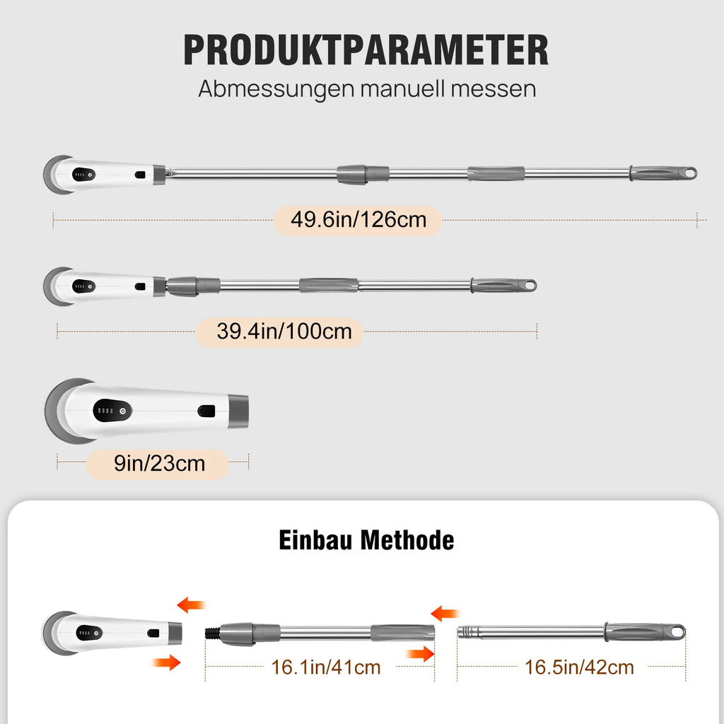 ✔ ADJUSTABLE LENGTH - The Electric Spin Scrubber has 2 stainless steel handles that are adjustable from 42.5 inches to 52 inches in length. Short handle for close up cleaning (e.g. sinks, cookers) and extended long handle for long distance cleaning (e.g. windows, floors). Use this versatile cleaning brush not only to clean all areas, but also to free your knees and back.