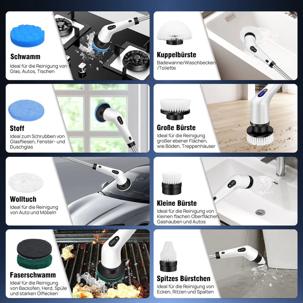 ✨ 10 MULTI-PURPOSE BRUSH HEADS - Electric rotary scrubber kit includes 10 interchangeable brush heads. Can correspond to the cleaning of various environments. Such as bathroom tubs, kitchens, grills, cookers, heavily greased walls, sinks, floors, grout, bathtubs, toilets, cars, floors, windows and hard-to-reach high spots or crevices. Use our powerful rotating cleaning brush to clean any corner like new. One can replace other brushes.