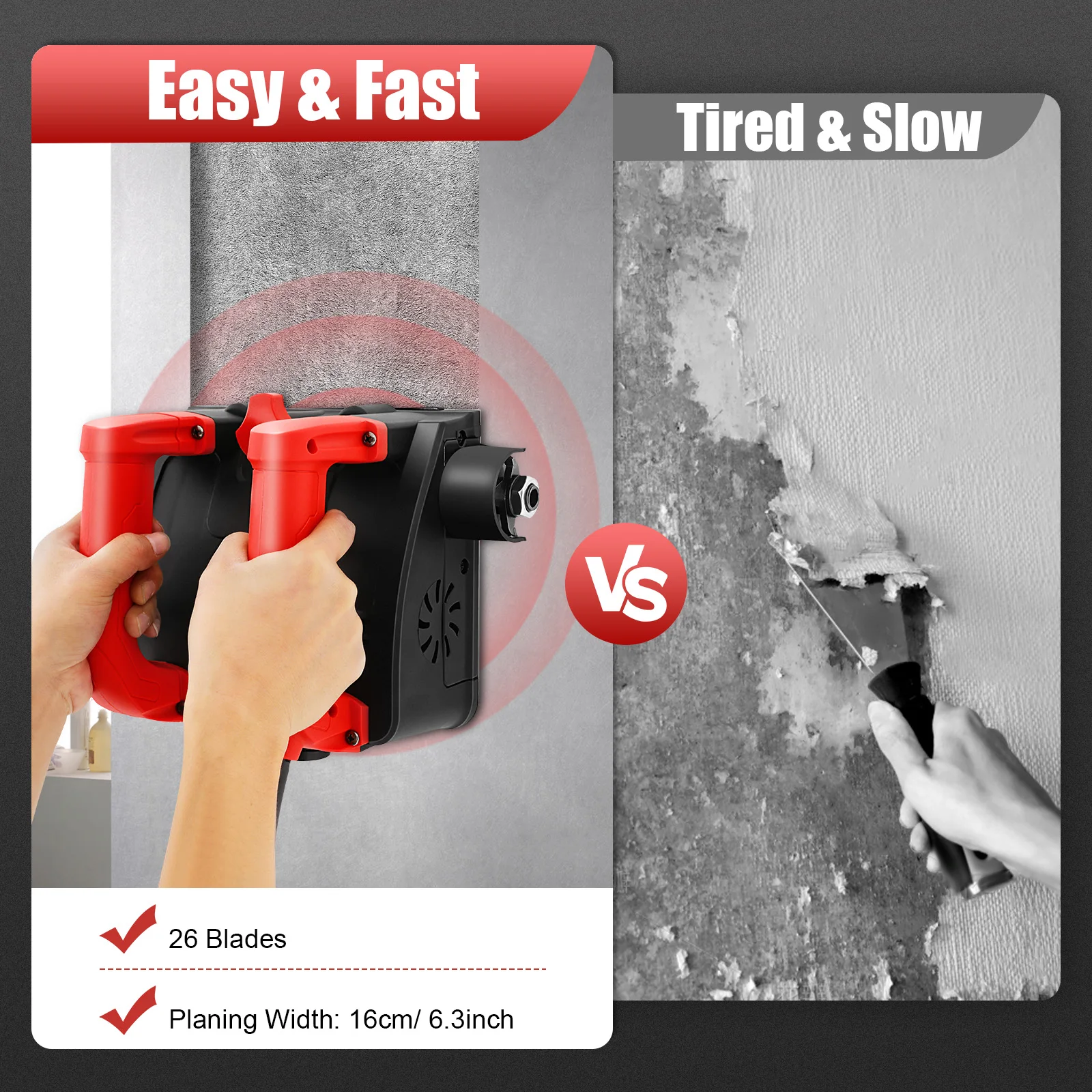 High Efficiency: With 1200W high power, an all-copper motor, high-strength steel gears, and 26 tungsten steel blades, it can plow a 6.3-inch wall at a time, greatly improving work efficiency. In addition, the professional side cutter is 90° shaped at one time, which can realize shoveling the wall without a dead angle and greatly shorten the renovation period.