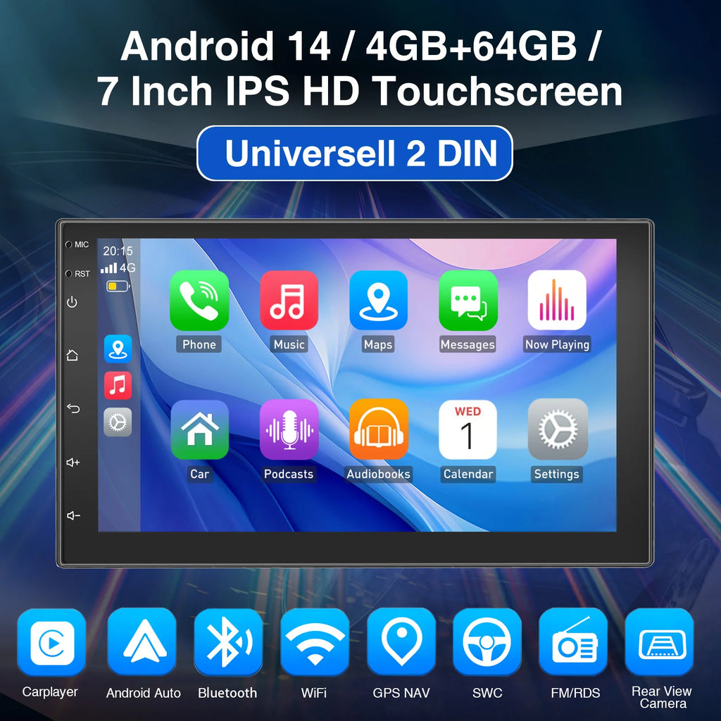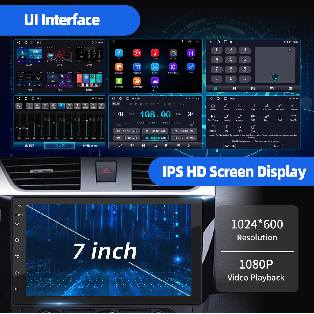 7 Inch 2 DIN Android Car Radio: The Android car radio with 7 inch IPS capacitive touch screen, 4GB RAM and 64GB ROM provides enough space to download your favourite apps and videos, so driving won't be boring anymore. With two USB ports, it supports fast mobile phone charging. With the rear microphone input, you can add a microphone to make your voice clearer (MIC is optional).