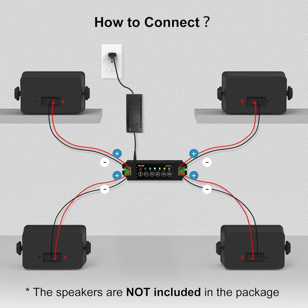 Bluetooth 5.0 With 4 Channel:Equipped with an advanced 5.0 version of Bluetooth's amplifier, which can effectively improve the transmission speed and quality, greatly reducing the damage to the sound quality when transmitting increase the effective working distance. Of course, the advanced 5.0 version is also compatible with all previous versions.One Herdio amplifier can be connected to four speakers at the same time, and with the advanced Bluetooth 5.0 transmission, you can play sound with better effect in a larger space.