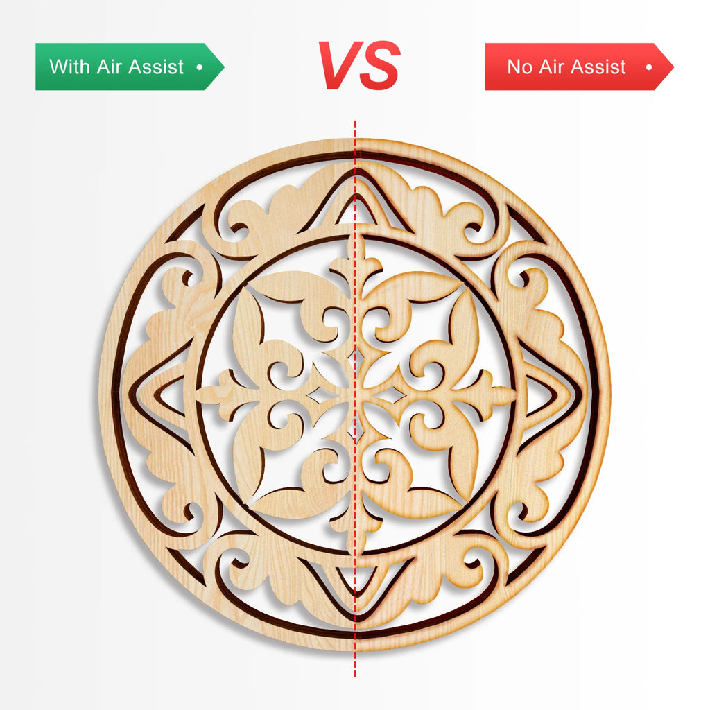 Low noise air pump equipped with adjustable airflow of 0-15L/min. Large and steady output airflow can blow away the smoke and dust generated during laser cutting. Prevent smoke and dust from attenuating laser energy, and increase the lifespan of the laser module lens. Help cut faster cleaner and deeper.