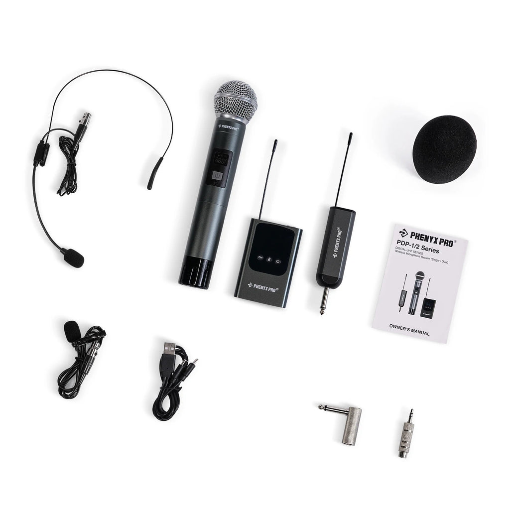 Phenyx Pro is dedicated to inspiring people to achieve next-level sound performance and exploring better wireless experience. The PDP-2 dual digital wilress microphone system is our new solution to balances convenience and professionalism. With the UHF frequency deisgn, it boasts advanced digital circuitry for stellar sound within small-scale indoor and outdoor stages. It's a good-to-go audio solution for karaoke, weddings, DJ parties, church sermons, broadcast, meetings, etc.