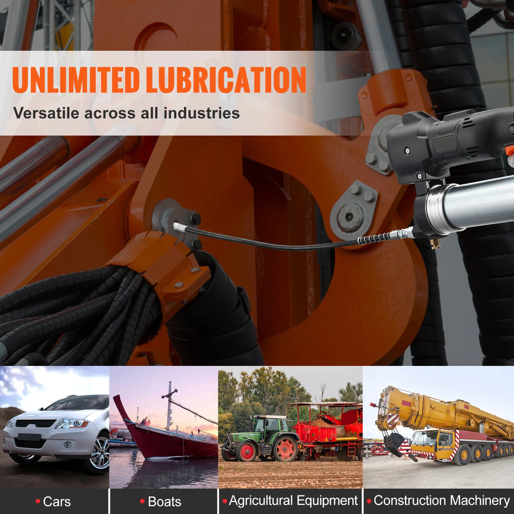 Ready for Anything: This cordless grease gun kit isn't picky. It's not just for machinery – it's perfect for cars, boats, farm equipment, and construction machinery. From factories to fields, docks to workshops, it's ready for action wherever you need it.