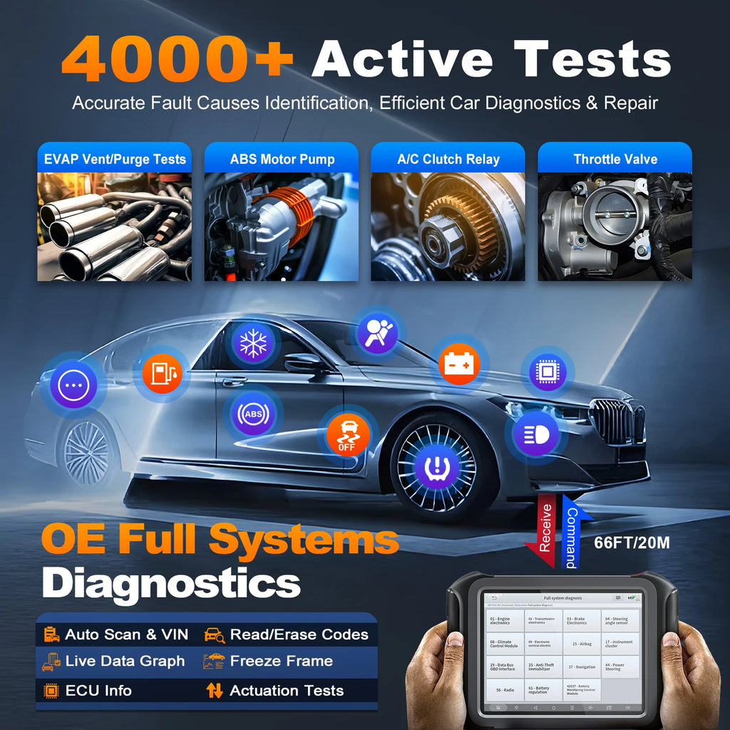 Full bi-directional control ability to verify system input/output by sending commands to vehicle’s systems/components. Such as EVAP Tests, Compression Test, turn on/off radiator fan, A/C Clutch On/Off, Fuel Pump, Window/Mirror/Door Lock Test, Pump and Value Tests, Interior & exterior lights Test, Sound horn Test, etc