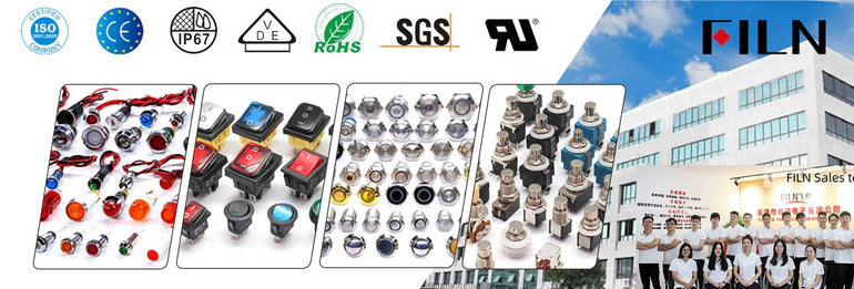 FILN produces indicator lights, button switches, boat switches, guitar switches, touch control system switches, waterproof microswitches and other products.