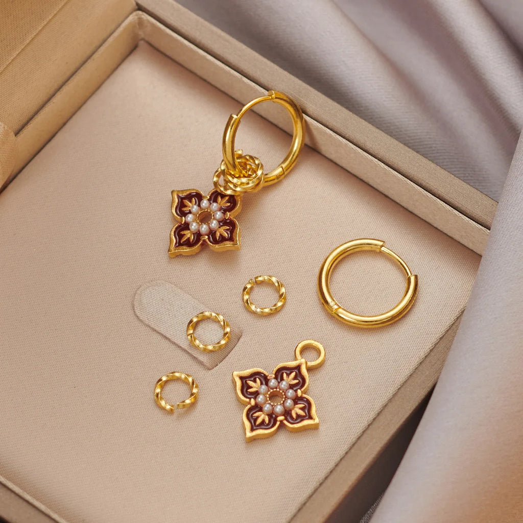 Ethnic Chinese Colorful Enamel Earrings for Women Retro Design Gold Plated Flower Shaped Multiple Wear Ways Luxury Jewelry Gifts