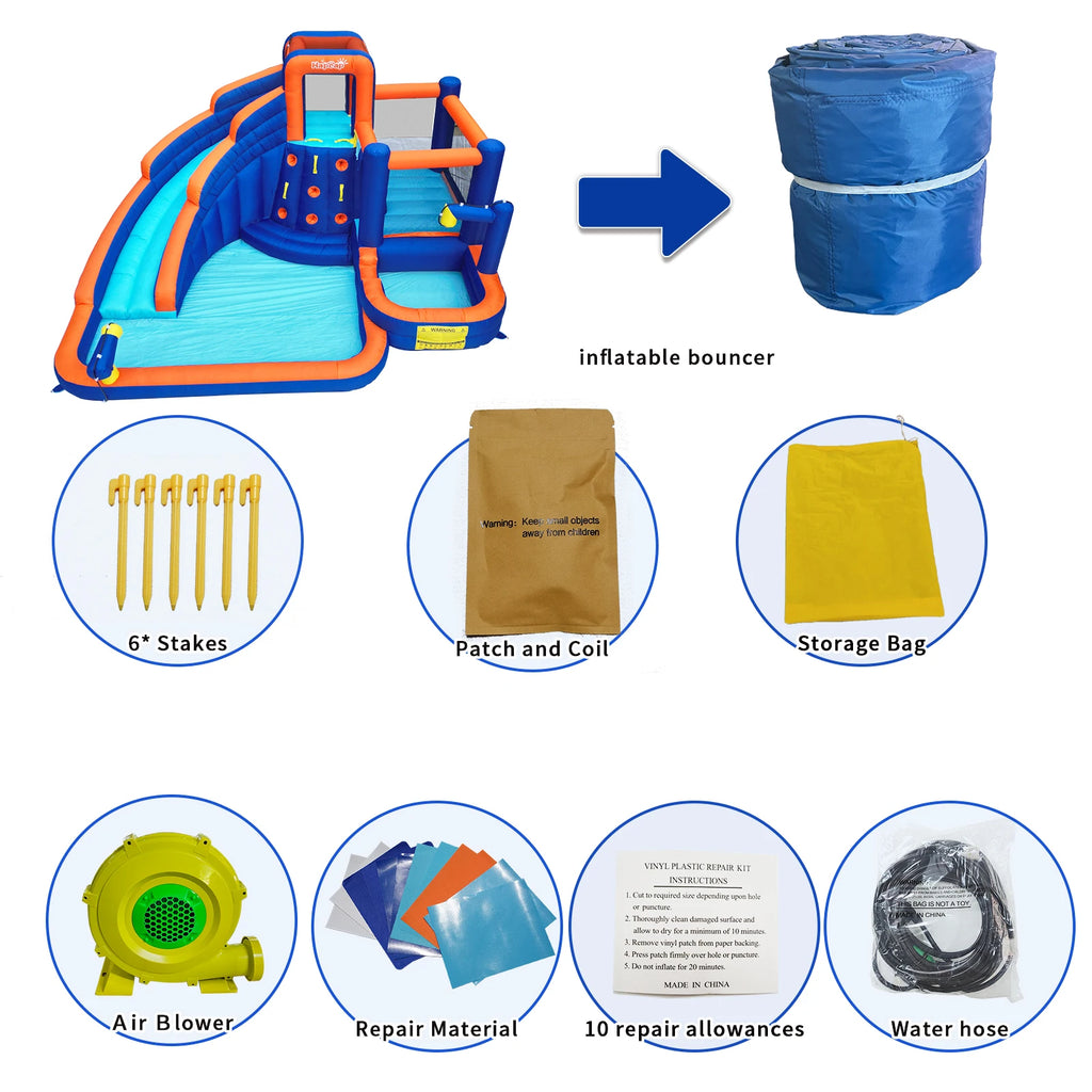 【Easy to Use and Carry 】The inflatable water house castle can inflated swiftly within 2 minutes by the powerful air blower keeps the bouncy castle firmly and safely.This inflatable bouncer includes the bouncer, air blower, water tube, repair patches, ground stakes, and a portable carrying bag.The inflatable bounce house with stakes can be firmly fixed to the ground, not easy to shake.At the same time, the disassembly is also very fast, the included storage bag can be easily carried to any place.Warm tips: Please wait for the bouncer dry before rolling-up for storage.