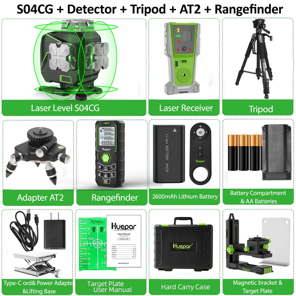 Huepar S04CG-C Set 4D 16 Lines Cross Line Laser Level LCD/Bluetooth/Remote Laser Tools With Detector Tripod Rangefinder Adapter