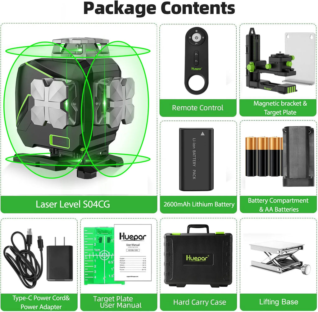 1 x Huepar S04CG-C Green Laser Level 1 x Hard-shell Carry Case 1 x Wall Hanging Plate 1 x Green Target 1 x Multifunctional Wall Bracket 1 x 2600mAh Li-ion Battery 1 x Remote Control 1 x AA Battery Compartment 4 x AA battery ( AA battery is not included if ships from China) 1 x Power Adapter 1 x Type-C Cord 1 x Lifting Base 1 x Multi-language manual |