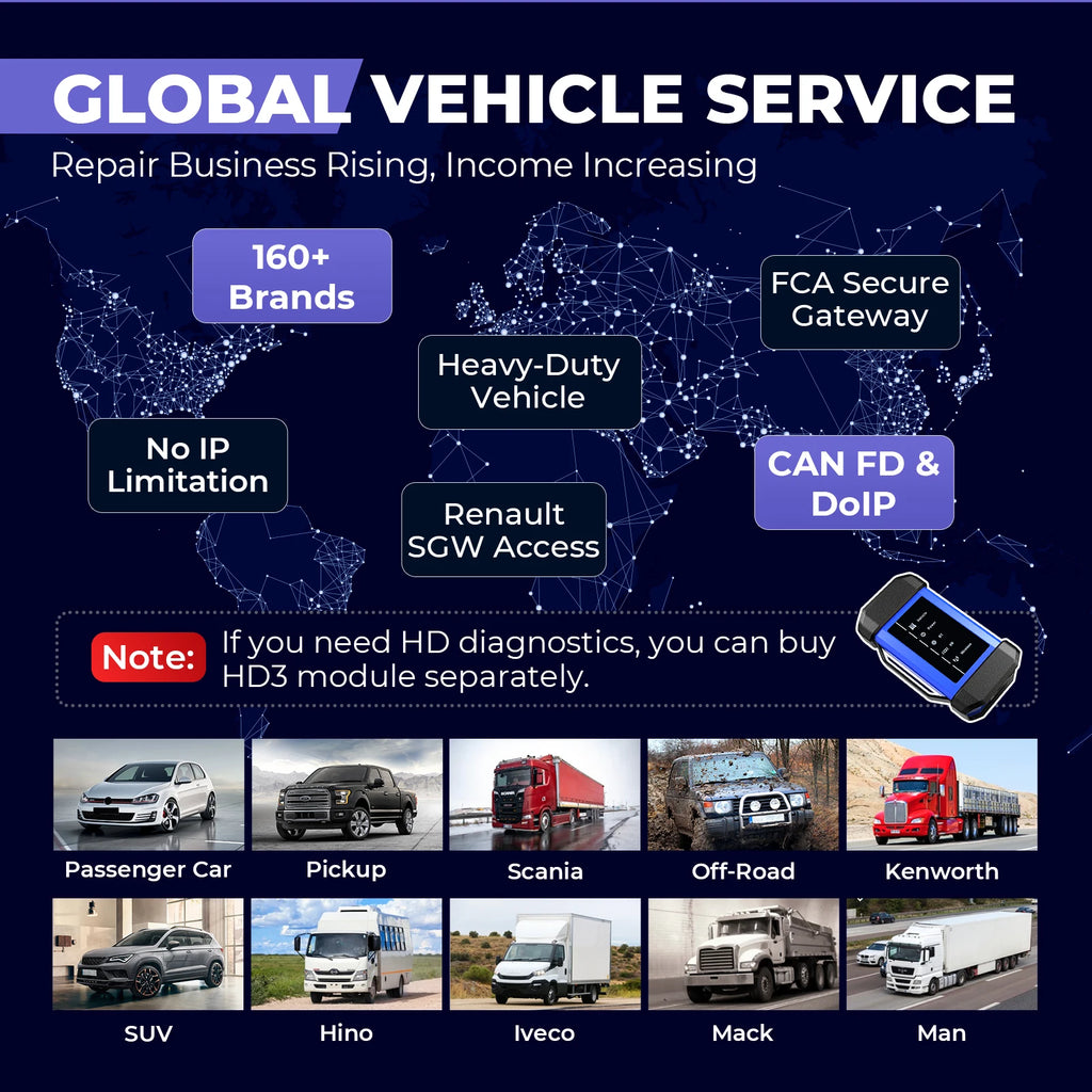 [Global Vehicle Coverage: 160+ Brands + HD Truck Diagnostics + FCA & Renault SGW Vehicles]