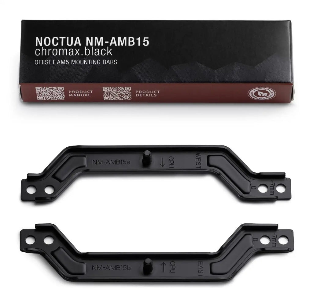 The NM-AMB13 are offset AM5 mounting bars for Noctua CPU coolers with 83mm mounting pitch that require their mounting points at the east and west side of the socket for optimal orientation, such as the popular NH-U12P (SE2), NH-U12(F), NH-U9B (SE2) or NH-U9(F) (see detailed compatibility list). By offsetting the heatsink 7mm towards the south side of the socket, more pressure is applied right above the CPU’s CCD(s). This improved contact exactly at the processor’s hotspot can significantly reduce CPU temperatures with improvements in the range of 1-3°C. Replacing the standard mounting bars and re-using the original spacers and screws, the NM-AMB13 are a simple yet highly efficient measure for optimising thermal performance on AM5-based AMD Ryzen CPUs.