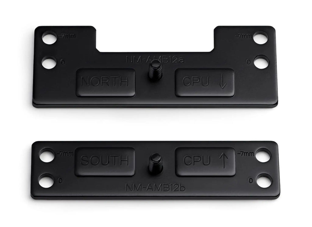 The NM-AMB12 are offset AM5 mounting bars for Noctua CPU coolers with 83mm mounting pitch that require their mounting points at the north and south side of the socket for optimal orientation, such as the popular NH-D15(S), NH-D14, NH-C14S or NH-D9L (see detailed compatibility list). By offsetting the heatsink 7mm towards the south side of the socket, more pressure is applied right above the CPU’s CCD(s). This improved contact exactly at the processor’s hotspot can significantly reduce CPU temperatures with typical improvements in the range of 1-3°C. Replacing the standard mounting bars and re-using the original spacers and screws, the NM-AMB12 are a simple yet highly efficient measure for optimising thermal performance on AM5-based AMD Ryzen CPUs.