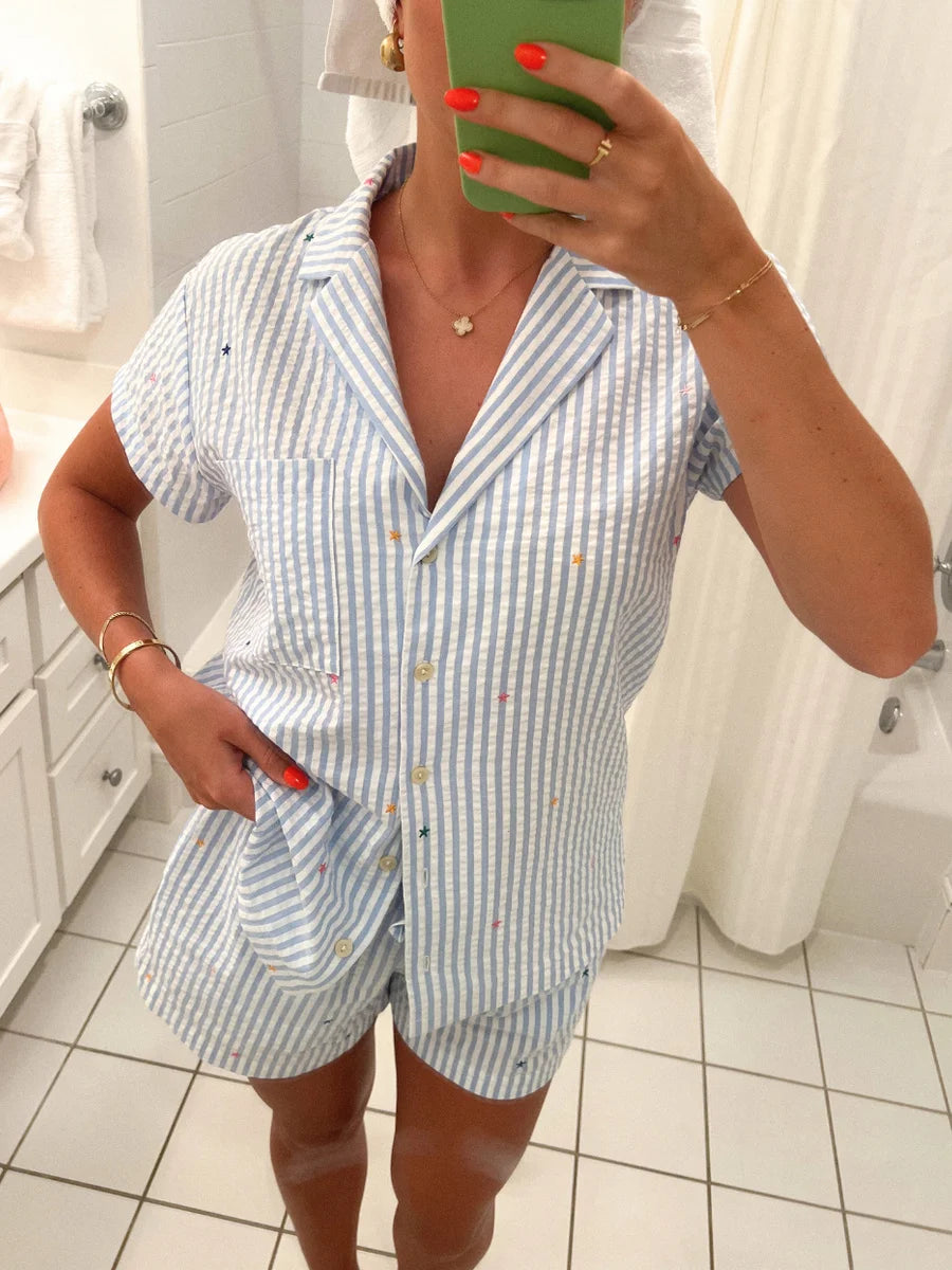 Women’s 2 Piece Casual Sets Lounge Outfits Cute Love Striped Print Short Sleeve Shirt + Drawstring Lace up Shorts Sets Homewear